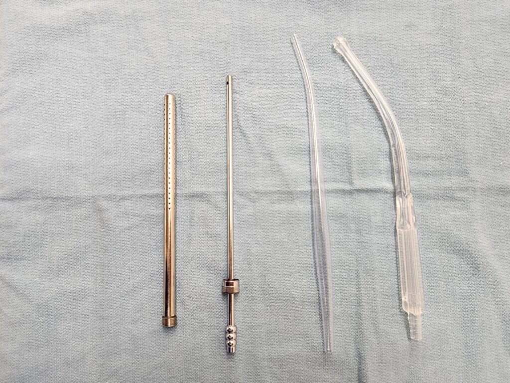 This photo shows commonly used suction tips for fluid removal and abdominal retractors used in general surgery to hold back soft tissue. All are part of the Retractor/Accessory instrument category.