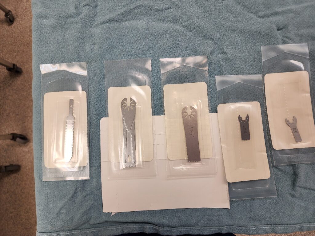These blades are sharp as their main objective is to cut bone by either a reciprocating, cutting action from front to back, or an oscillating, cutting action from side to side. Saw blades are disposable but the power instruments they are attached to are reusable. Precaution must be taken to ensure the safety mechanism is on to prevent accidental activation of power.